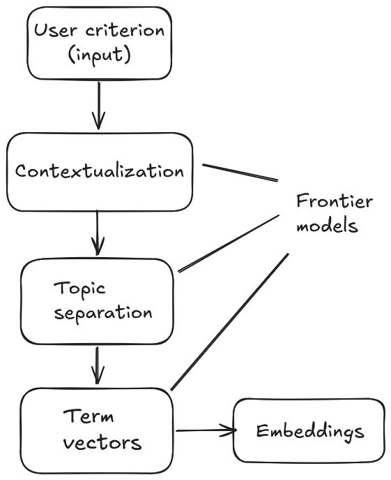 It is rather easy. I just tell frontier model to enrich the criteria, and it does. The result is usually a long piece of text that brings up the main terms. It transfers the implicit intention to explicit terms and topics.
