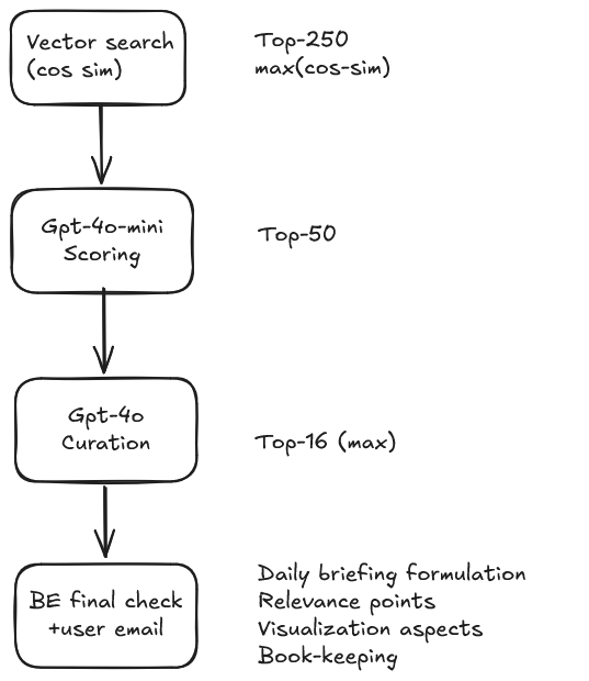 The hard part was what to do with the pre-fetched articles. It was clear I had to take top-250 to cover all relevant articles. But feeding 250 articles to frontier model would be far too expensive.